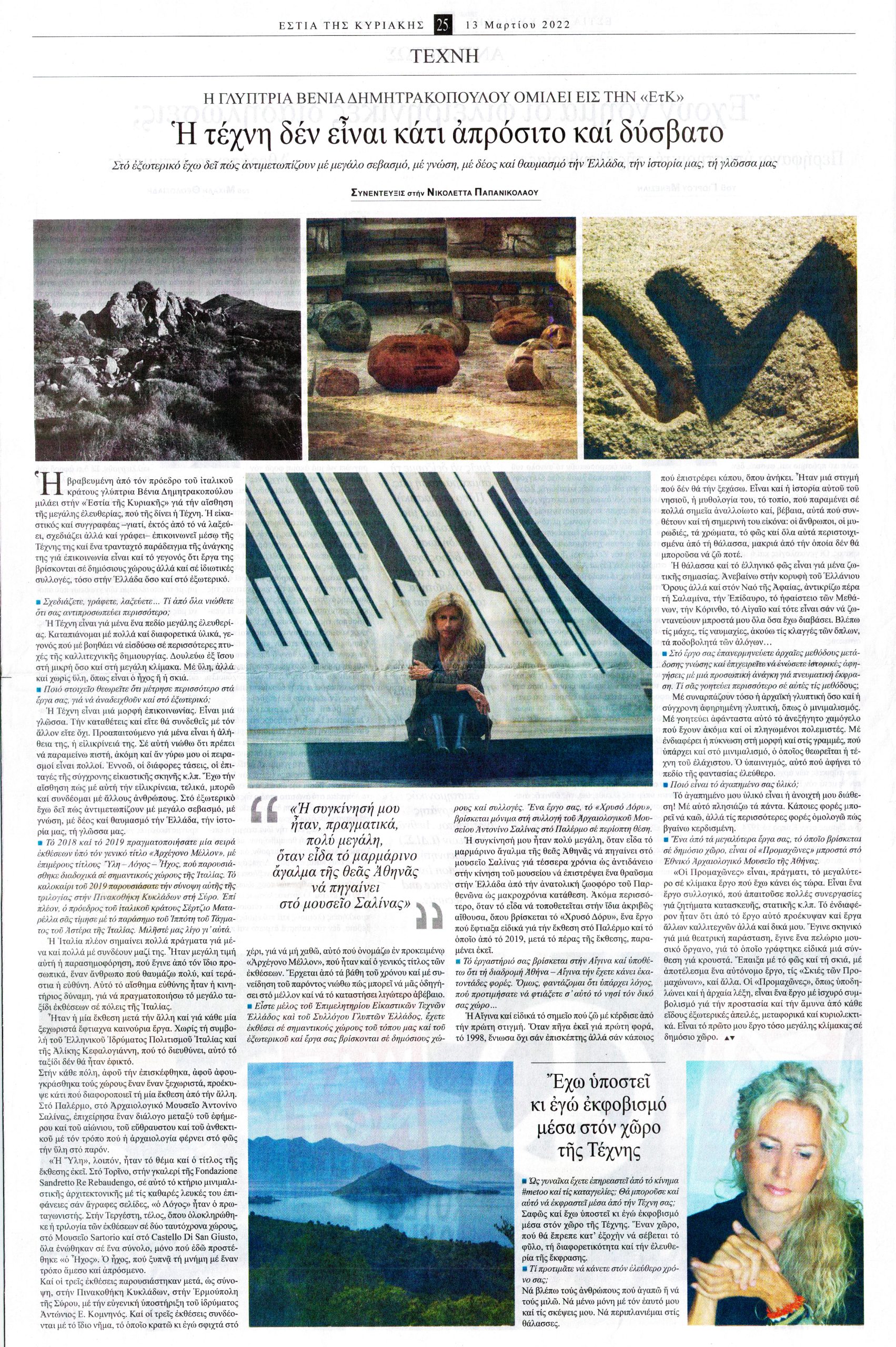 - Εφημερίδα Εστία της Κυριακής: Βένια Δημητρακοπούλου | 13/03/2022 – scan, pdf